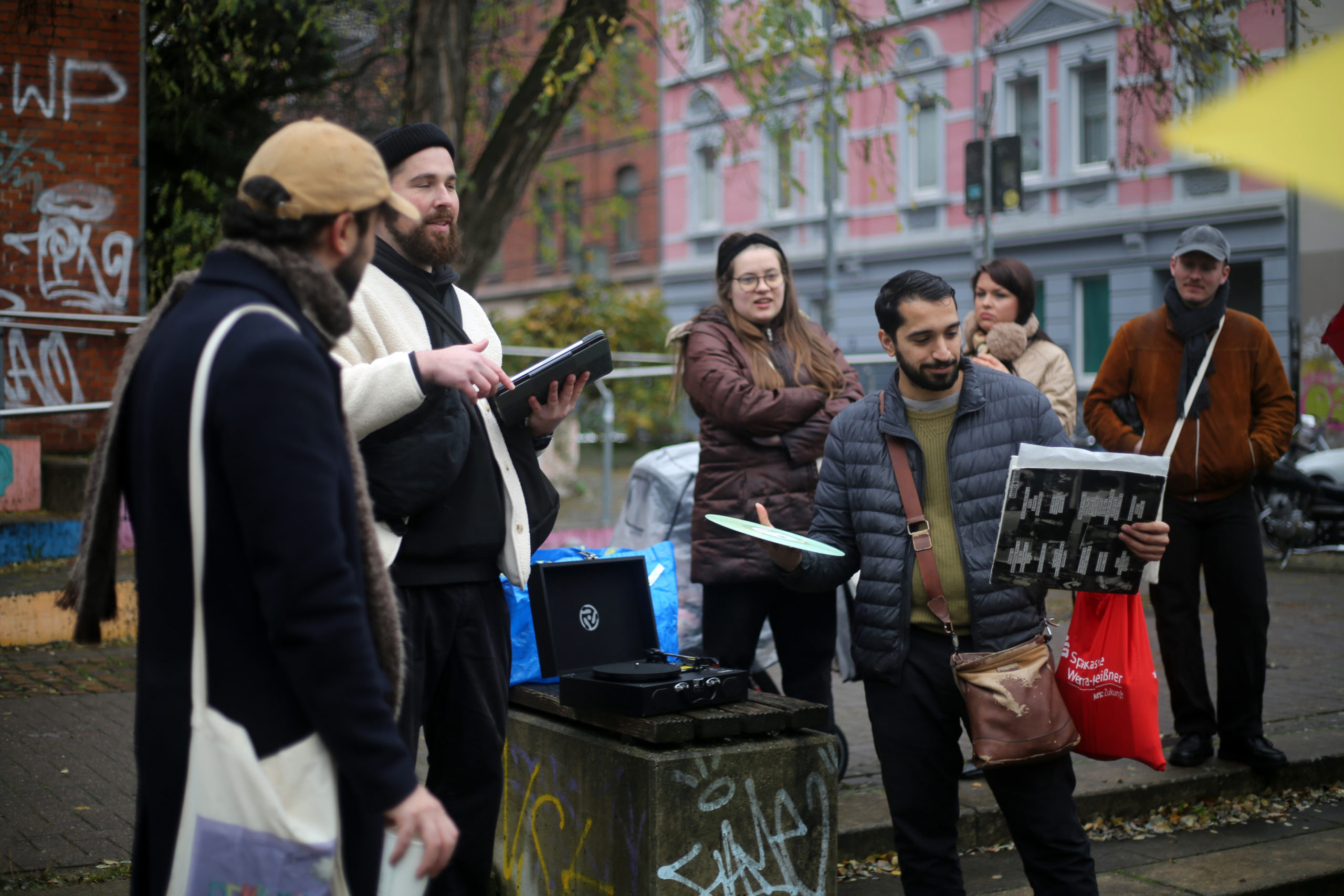Ebenso multimedial und interaktiv ging es am Sonntag weiter bei der Führung zu pluralen Stadtgeschichte(n) Hannovers mit Julius Matuschik und Dariush Safaei vom Cameo Kollektiv. Das Cameo Kollektiv, das mit Mitteln der kulturellen und politischen Bildung gesellschaftliche Vielfalt aufzeigen will, führte die Teilnehmenden durch verschiedene Epochen der Stadt und machte dabei wenig erzählte Geschichten sichtbar: Von der ersten muslimischen Bestattung im Jahr 1683 über das Zeitalter des Jazz, das in Hannover begann, Protestsongs in diversen Sprachen und Protestbewegungen in verschiedenen Teilen der Stadt wie am Ni una menos Platz, bis hin zum ersten Kurs zu queerer Liebe an der VHS. Einen tiefen Riss durch die plurale Gesellschaft zog die NS-Zeit, wie Julius Matuschick betonte. Trotz des Regens fesselte die interaktive Führung die Teilnehmenden: An verschiedenen Stationen konnten sie beispielsweise Musik der Punkband Blitzkrieg auf einem Hotkoffer anhören, mit Kreide ihre politischen Forderungen und ihre Standpunkte auf dem Boden anbringen, und beim Spazieren über digital abrufbare Interviews mit Hannoveraner_innen oder Protestsongs weitere Perspektiven kennenlernen.
